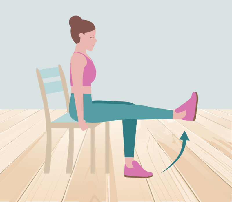 - Istu sohvalla tai tuolilla. Ojenna polvi suoraksi reisilihasta jännittäen. Lisää nilkkapainot tai laita kuminauha tuolin jalkaan vastukseksi. Toistot 3–5 x 10–20 molemmilla jaloilla.