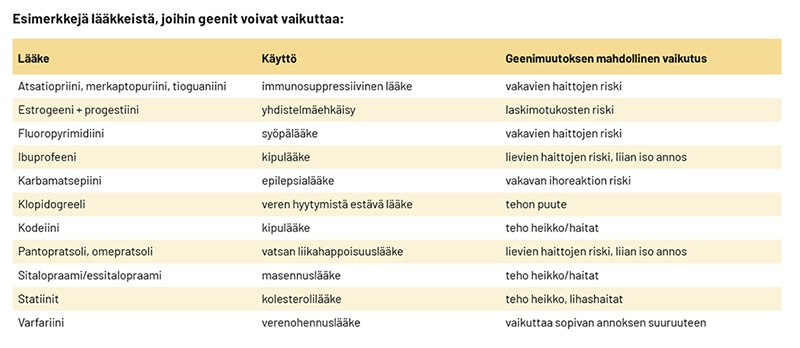 Lääkkeet vaikuttavat elimistössä yksilöllisesti eri tavoin. Perimä voi vaikuttaa niin, ettei tietty lääke tehoa lainkaan tai siitä tulee haittoja. Asia voidaan tarvittaessa selvittää farmakogeneettisellä tutkimuksella.