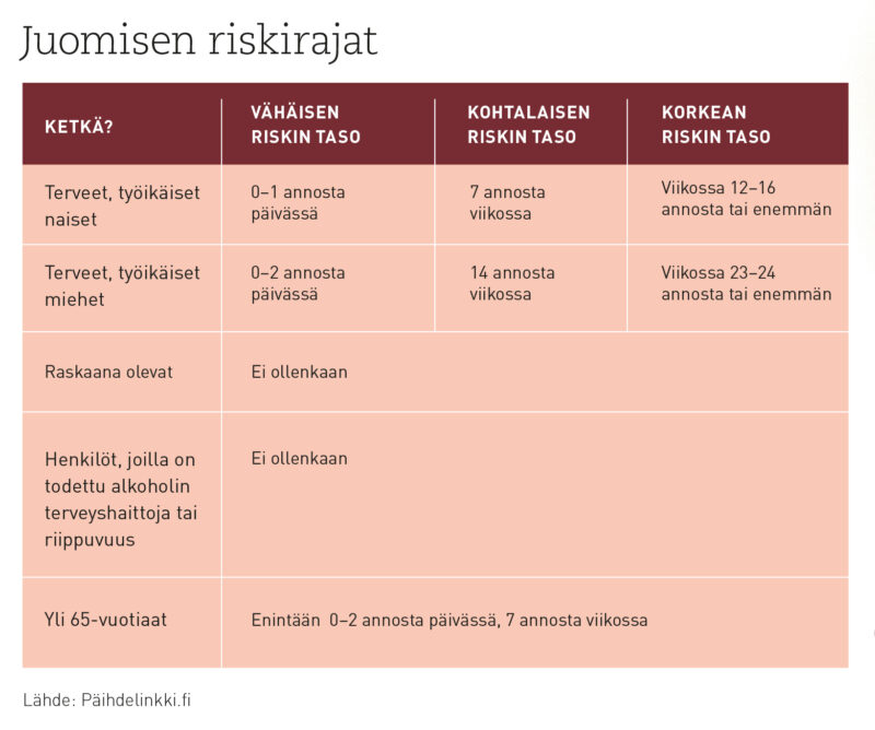 – Elimistön kyky sietää alkoholia laskee iän myötä, ja siksi iäkkäillä korkean riskin rajana pidetään seitsemää alkoholiannosta viikossa. Kerralla ei tule ottaa kahta annosta enempää.